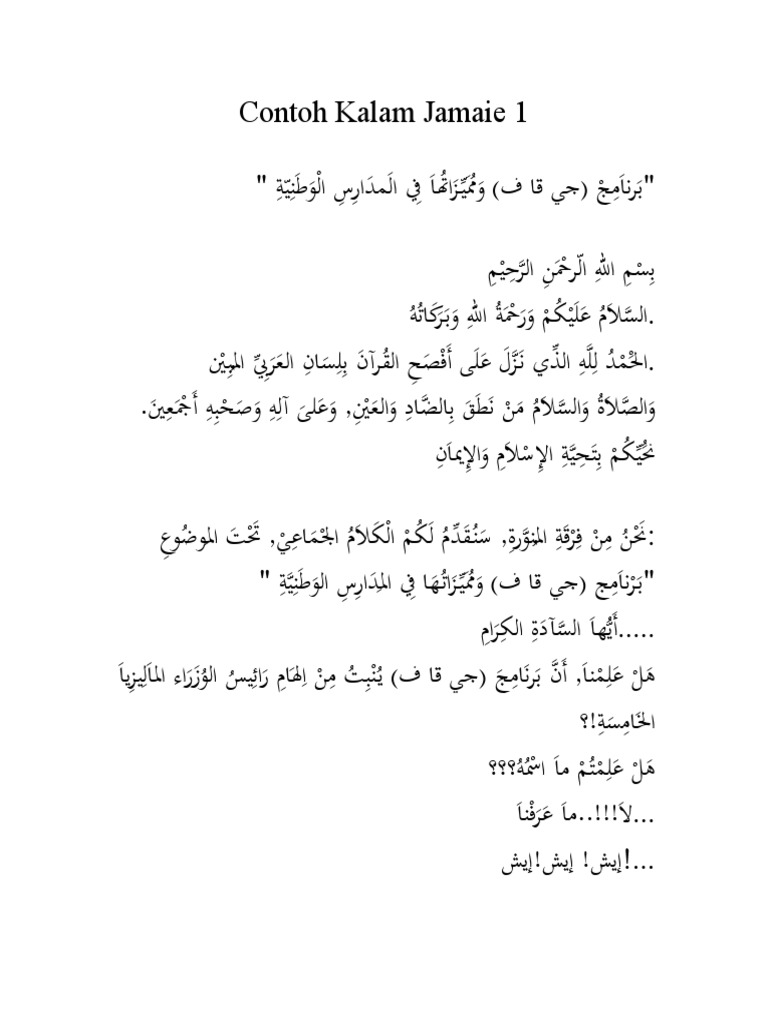 Aku bersaksi bahwa tidak ada Tuhan melainkan Allah. Teks kalam jamie SBPIS di MITC kalam jamaie السلام عليكم ورحمة الله وبركاته نحن من فرقة حور النوالسنقدم لكم جميعا الكلام الجماعي تحت الموضوع ماليزيا ما أجمل وطننا. CONTOH TEKS KALAM JAMAIE BAHASA ARAB كلام جماعي اللغة العربية.